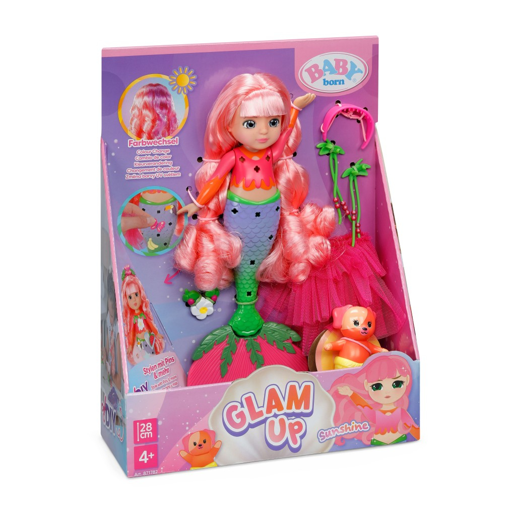 Vítejte ve světě BABY born Glam Up! Zde se vše točí kolem kreativity, třpytu a nekonečných možností tvoření. Glam Up mořské víly zvou děti, aby rozvíjely svou fantazii a každý detail upravovaly podle vlastního vkusu. Pokaždé jinak a originálně. Mořská víla Sunshine miluje proměny a hraní si s barvami. Od hlavy až po ploutev ji lze česat, zdobit a dekorovat podle vlastního stylu. Díky přiloženým textilním doplňkům, barevným nacvakávacím ozdobám a roztomilému zvířátku s odnímatelnou ploutví vznikají pokaždé nové vzhledy. Přiložená brožurka inspiruje k dalším nápadům i s materiály, které mají děti doma. Obzvlášť kouzelné jsou dlouhé růžové vlasy Sunshine, které na slunci mění barvu a přinášejí skutečný wow efekt. Ať už jde o třpytivé účesy, kreativní dekorace nebo hry plné fantazie s BABY born Glam Up Sunshine objevují děti nekonečné možnosti tvoření a mohou nechat svou kreativitu volně plynout. • Sunshine – Glam Up mořská víla s magickým UV barevným efektem • Růžové vlasy mění na slunci barvu • Celou postavičku lze upravovat – od účesu až po ploutev • S textilními doplňky, barevnými nacvákavacími ozdobami, roztomilým zvířecím kamarádem a deníčkem plným inspirace. • Pro kreativní česání, zdobení a hry plné fantazie • Vhodné pro děti od 4 let – kreativní zábava se stylingem a účesy plná lesku