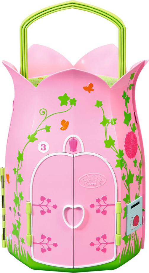 Domeček pro všechny obyvatele pohádkového světa Storybook. Otevřením domečku ve tvaru květiny se odhalí nádherný domov pro víly, který je plný nápadů na hraní a různých doplňků. Obývací pokoj je vybaven stolečkem a krbem. Ze stropu herny visí houpačka. Přihrádka na stěně je skvělým místem pro uložení kouzelné hůlky, třeba když se víla houpe na houpačce. Když se někdo na houpačce zasněně houpe tam a zpět, slyší to celý pohádkový svět. Při houpání totiž zvoní květinový zvonek připevněný k horní části houpačky. Na zábradlí první střešní terasy lze připevnit dalekohled. Je to skvělé místo na sledování nových příběhů a vyhlížení kouzelných kamarádů. Po celodenním dobrodružství můžou obyvatelé pohádkového světa odpočívat na lehátku v druhé části terasy. Rukojeť ve tvaru obří trávy poskytuje dostatek stínu. Zároveň lze díky praktické rukojeti uzavřený domeček jednoduše přenášet. • Kvalitní doplněk pro originální panenky BABY born Storybook. • Pro panenky velikosti 18 cm. • Pro radost z nápadité, rozmanité a dlouhotrvající hry. BABY born Storybook Domeček – skládací domeček se stolečkem, krbem, odpočinkovou zónou a dalekohledem.