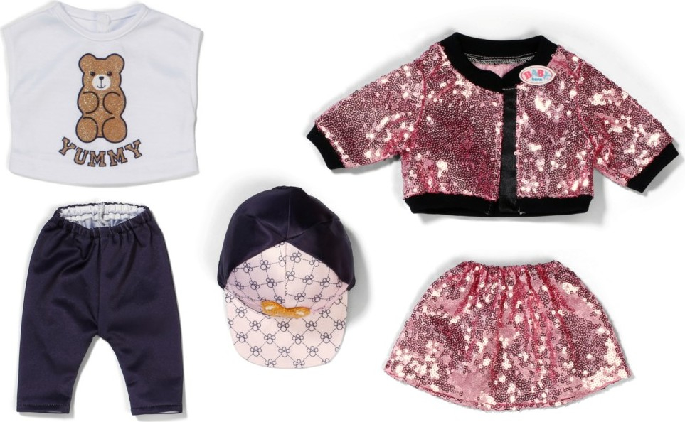 Růžové flitry na sukni a bundě nádherně září. I zbytek outfitu je opravdu stylový a stojí za to ho vidět! • Outfit s růžovou flitrovou bundou, sukní, tričkem, čepicí a legínami • Vhodné pro panenky velikosti 43 cm a pro medvídky BABY born Teddy • S ramínkem z recyklovaného materiálu • Kvalitní oblečení a doplňky pro radost z nápadité, rozmanité a dlouhotrvající hry