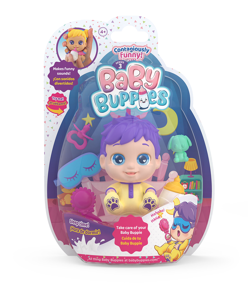 Baby Buppies miminko je vhodné pro děti od 4 let. Vydává reálné zvuky jako opravdové miminko. Miminka mají 3 různé režimy: spinkání, koupání a papání. Každé miminko má vždy nastavený pouze jeden z těchto režimů. V každém balení je k dispozici jedno miminko a spoustu doplňků, letáček a rodný list. Pro děti od 4let.