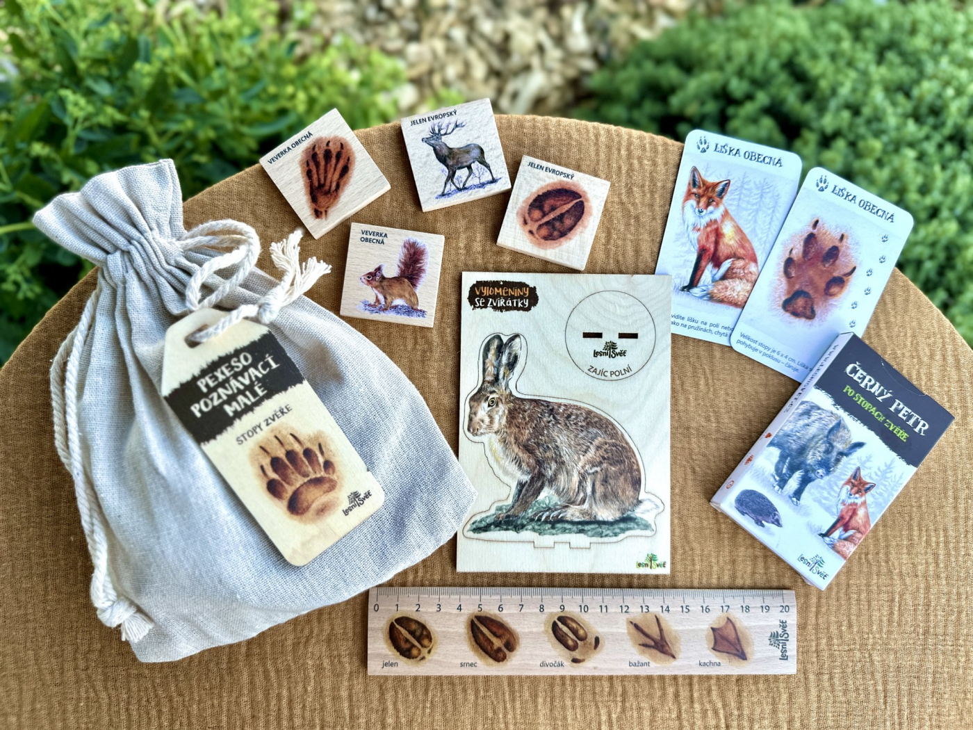 Balíček obsahuje výrobky, které vyrábí u nás v dílně české ruce, z kvalitního českého certifikovaného dřeva. Balení obsahuje: 1x pexeso poznávací malé Stopy, 1x Černý Petr Po stopách zvěře, 1x pravítko 20 cm stopy. Jako DÁREK zdarma vám přibalíme vylomeninu M zajíc. K balíčku máte DOPRAVA ZDARMA. Autorem kreseb jsou čeští ilustrátoři, obrázky jsou chráněny autorskými právy. S balíčkem si užijete spoustu zábavy a poznání. Lesní svět = značka s ekologickým certifikátem udržitelného hospodářství PEFC. Všechny výrobky jsou vyrobeny s ohledem na životní prostředí. Přečtěte si o zvýhodněném balíčku Stopy více v našem článku ZDE