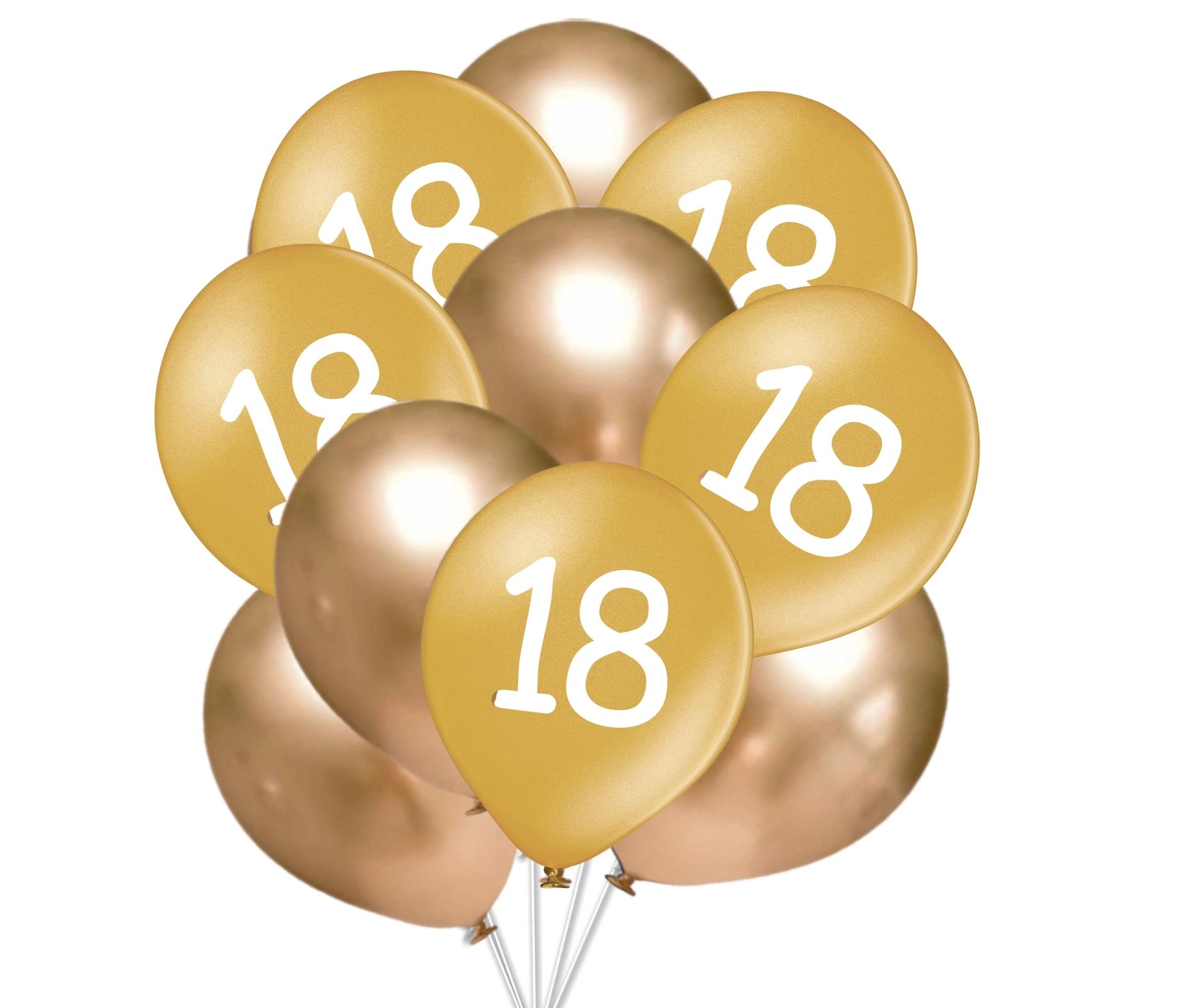 Balónky 18 narozeniny zlaté 10 ks 30 cm mix V balení je 5 x ks balónků zlatých metalických s potiskem čísla (b80107) a 5 x ks balónků zlatých chromových. Doveďte svou slavnostní výzdobu k dokonalosti s chromovými balónky ve zlatém odstínu. Průměr balónku v nafouknutém stavu je 30 cm, výška 38 cm a obvod 85-90 cm. Objem balónku je 15 L. Chromové balónky ve zlatém odstínu jsou elegantní dekorací pro jakoukoliv příležitost. Můžete je nafukovat heliem anebo vzduchem. Doba létání latexových balonků nafouknutých heliem je 8-12 hodin – v závislosti na objemu balónků a okolní teplotě. Delší dobu létání mají foliové balónky – několik dní. Dobu létání latexových balónků je možné prodloužit gelem HI FLOAT.