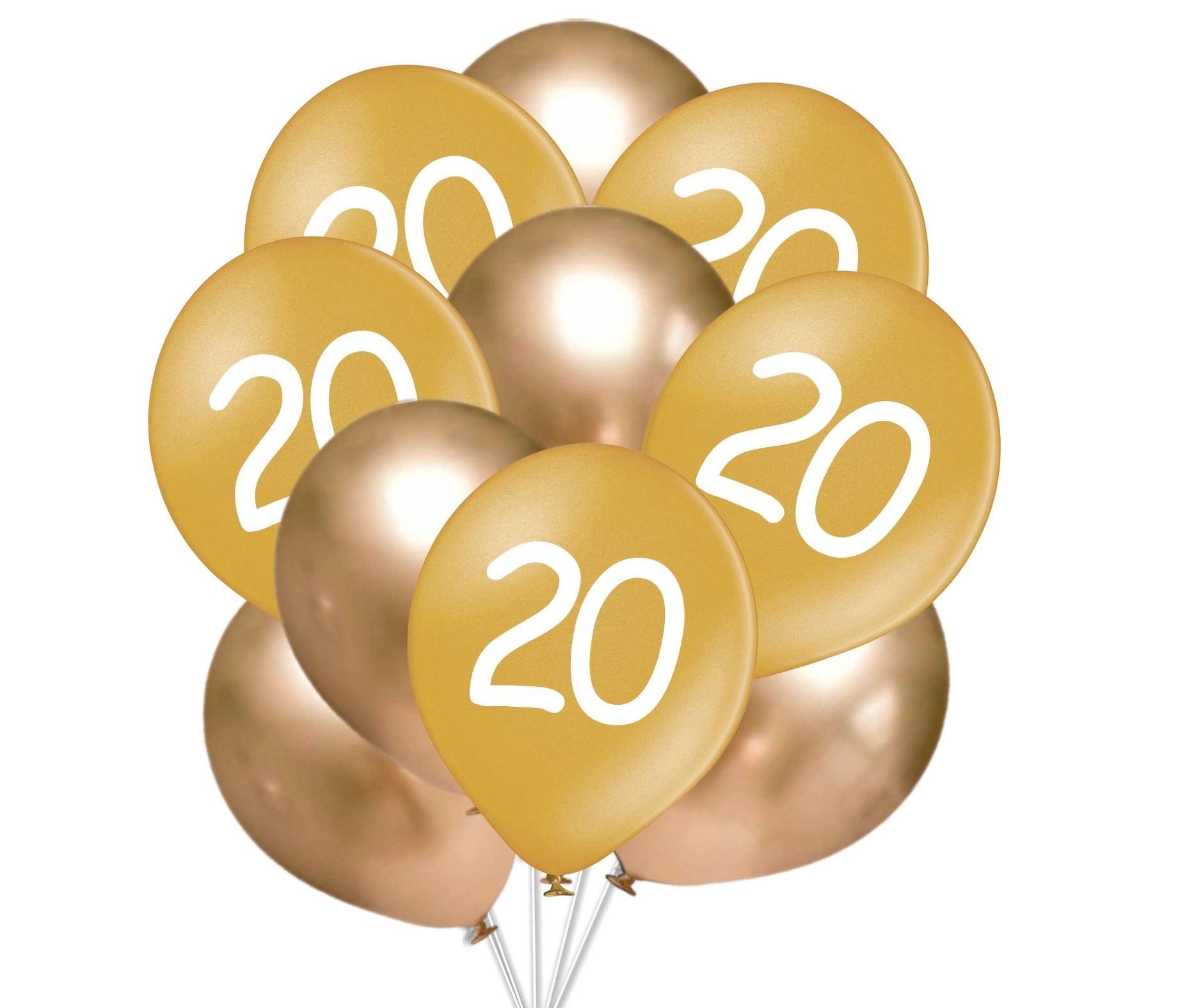 Balónky 20 narozeniny zlaté 10 ks 30 cm mix V balení je 5 x ks balónků zlatých metalických s potiskem čísla (b80109) a 5 x ks balónků zlatých chromových. Doveďte svou slavnostní výzdobu k dokonalosti s chromovými balónky ve zlatém odstínu. Průměr balónku v nafouknutém stavu je 30 cm, výška 38 cm a obvod 85-90 cm. Objem balónku je 15 L. Chromové balónky ve zlatém odstínu jsou elegantní dekorací pro jakoukoliv příležitost. Můžete je nafukovat heliem anebo vzduchem. Doba létání latexových balonků nafouknutých heliem je 8-12 hodin – v závislosti na objemu balónků a okolní teplotě. Delší dobu létání mají foliové balónky – několik dní. Dobu létání latexových balónků je možné prodloužit gelem HI FLOAT.
