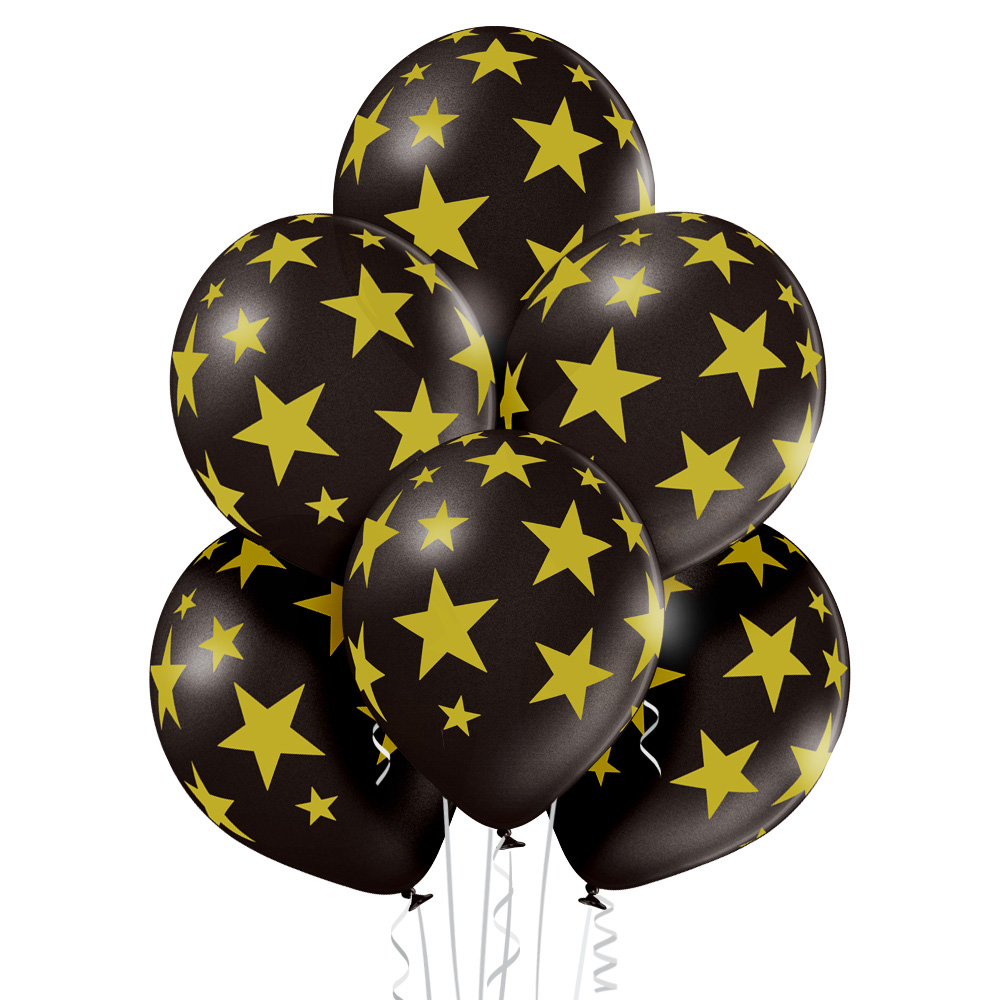 Balónky černé s potiskem zlaté hvězdy 6 ks 30 cm Doba létání latexových balonků nafouknutých heliem je 8-12 hodin – v závislosti na objemu balónků a okolní teplotě. Delší dobu létání mají foliové balónky – několik dní. Dobu létání latexových balónků je možné prodloužit gelem HI FLOAT.