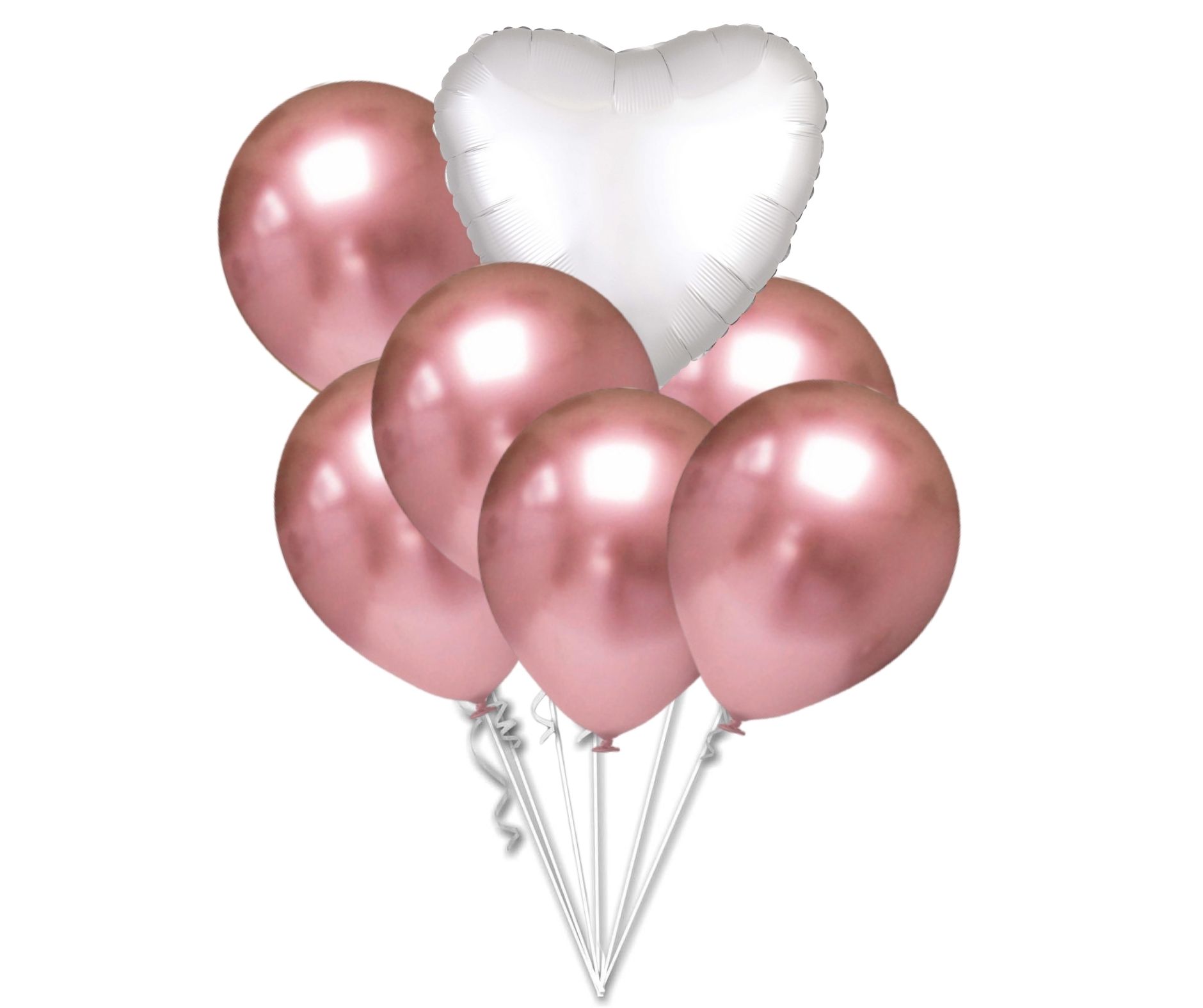 Balónky chromové růžovo-zlaté a bílé srdce set V balení je 6 x ks chromových růžovo-zlatých balónků průměr 30 cm a fóliový balónek bílé srdíčko 42 cm. Objem chromového balónku je 15 L a fóliového balónku je 11 L. Doveďte svou slavnostní výzdobu k dokonalosti s chromovými balónky v růžovo-zlatém odstínu. Průměr balónku v nafouknutém stavu je 30 cm, výška 38 cm a obvod 85-90 cm. Objem balónku je 15 L. Chromové balónky v růžovo-zlatém odstínu jsou elegantní dekorací pro jakoukoliv příležitost. Můžete je nafukovat heliem anebo vzduchem. Doba létání latexových balonků nafouknutých heliem je 8-12 hodin – v závislosti na objemu balónků a okolní teplotě. Delší dobu létání mají foliové balónky – několik dní. Dobu létání latexových balónků je možné prodloužit gelem HI FLOAT.