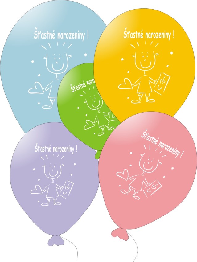 Balónky s českým potiskem - Šťastné narozeniny Mix barev - žlutá, zelená, modrá, růžová a levandulová barva. V balení je 5 kusů balonků. Kromě obyčejných balonků s českým potiskem máme pro Vás v nabídce i foliové balónky s českým nápisem Krásné narozeniny. Pokud chcete, aby balónky létaly, můžete navštívit sekci Helium anebo Helium set a zde vybrat balení, které Vám bude vyhovovat. Balonky lze nafukovat i vzduchem. Inspiraci pro Vaší dekoraci najdete na internetovém magazínu www.party-narozeniny.cz. Na narozeniny jsou dalším důležitým doplňkem "Dortové svíčky", popř. "Vystřelovací konfety" a "Dortové fontány". velikost B85 / 27cm /, objem 10l. Originální dekorací jsou balónky s jménem oslavence (latexové i foliové) anebo balonky s fotkou oslavence. Více informací získáte na emailu balonky@balonky.cz Doba létání latexových balonků nafouknutých heliem je 8-12 hodin – v závislosti na objemu balónků a okolní teplotě. Delší dobu létání mají foliové balónky – několik dní. Dobu létání latexových balónků je možné prodloužit gelem HI FLOAT.