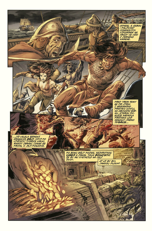 Po čase stráveném na širém moři se Conan vrací na souš a zjišťuje, že ho neustále pronásledují vzpomínky na Belit – královnu Černého pobřeží. Dokáže nebezpečná loupež zahnat jeho myšlenky na trýznivou minulost? Pro druhý svazek nových Conanových dobrodružství stvořili scenárista Jim Zub s výtvarníkem Dougem Braithwaitem vskutku neobyčejný a mimořádně napínavý příběh.