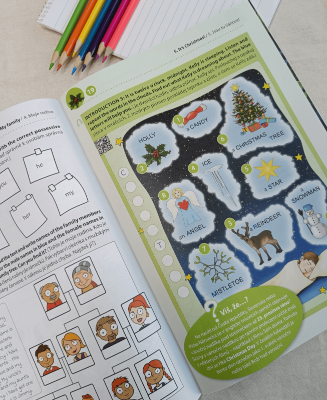 Pracovní sešit Barevná angličtina 3 je navržen jako ideální doplňkový materiál k většině publikací běžně používaných při výuce anglického jazyka na 1. stupni základních škol. Obsahuje různorodá zábavná cvičení s ilustracemi k vybarvování, luštění či doplňování. Tyto úlohy slouží ke zpestření a upevňování učiva jak v hodinách anglického jazyka, tak při domácí přípravě. Její součástí je i vyjímatelná karta s předlohou ke třem stolním hrám zaměřeným na probíranou slovní zásobu, klíč s řešeními úloh, anglicko-český slovník a online dostupné zvukové nahrávky s doprovodným přepisem. Jazyková úroveň: A0.1 (Starter+) V souladu s RVP ZV Pracovní sešit vhodně střídá typy cvičení, zohledňuje věk žáků, jejich kognitivní schopnosti i schopnost koncentrace. Cvičení se zaměřují na osvojení klíčové slovní zásoby a frází, anglický pravopis a na upevnění základních větných struktur. Propojení úloh s barevnou vizualizací žákům usnadňuje zapamatovat si větné struktury a pomáhá jim rozlišit rozdíly ve významu probírané slovní zásoby. Publikace je rozdělena do dvanácti lekcí, které jsou proloženy čtyřmi krátkými opakovacími kapitolami. Obsahově je koncipována tak, aby s ní mohli pracovat nejen žáci, kteří výuku anglického jazyka v 1. a 2. ročníku již měli, ale i ti, kteří s angličtinou ve 3. ročníku teprve začínají. Pracovní sešit sestavil odborný tým pedagogů a lektorů na základě zkušeností s výukou anglického jazyka na 1. stupni základních škol. Veškeré doplňkové materiály k pracovnímu sešitu Barevná angličtina 3 jsou ke stažení zde: Všechny zvukové nahrávky Přepis textů k poslechovým cvičením