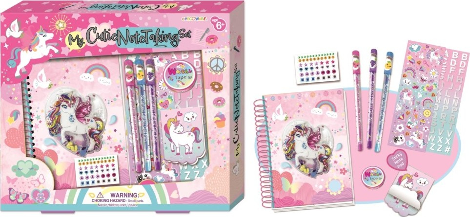 Zapiš si své zážitky a nakresli obrázky do bloku s jednorožcem. V balení této deníkové sady najdete Deník s motivem jednorožce, 3 gelová, třpytková pera s vůní, lepící poznámkové bločky, nálepky s obrázky a písmenky, lepící obrázkovou pásku. Vhodné pro děti od 6ti let.