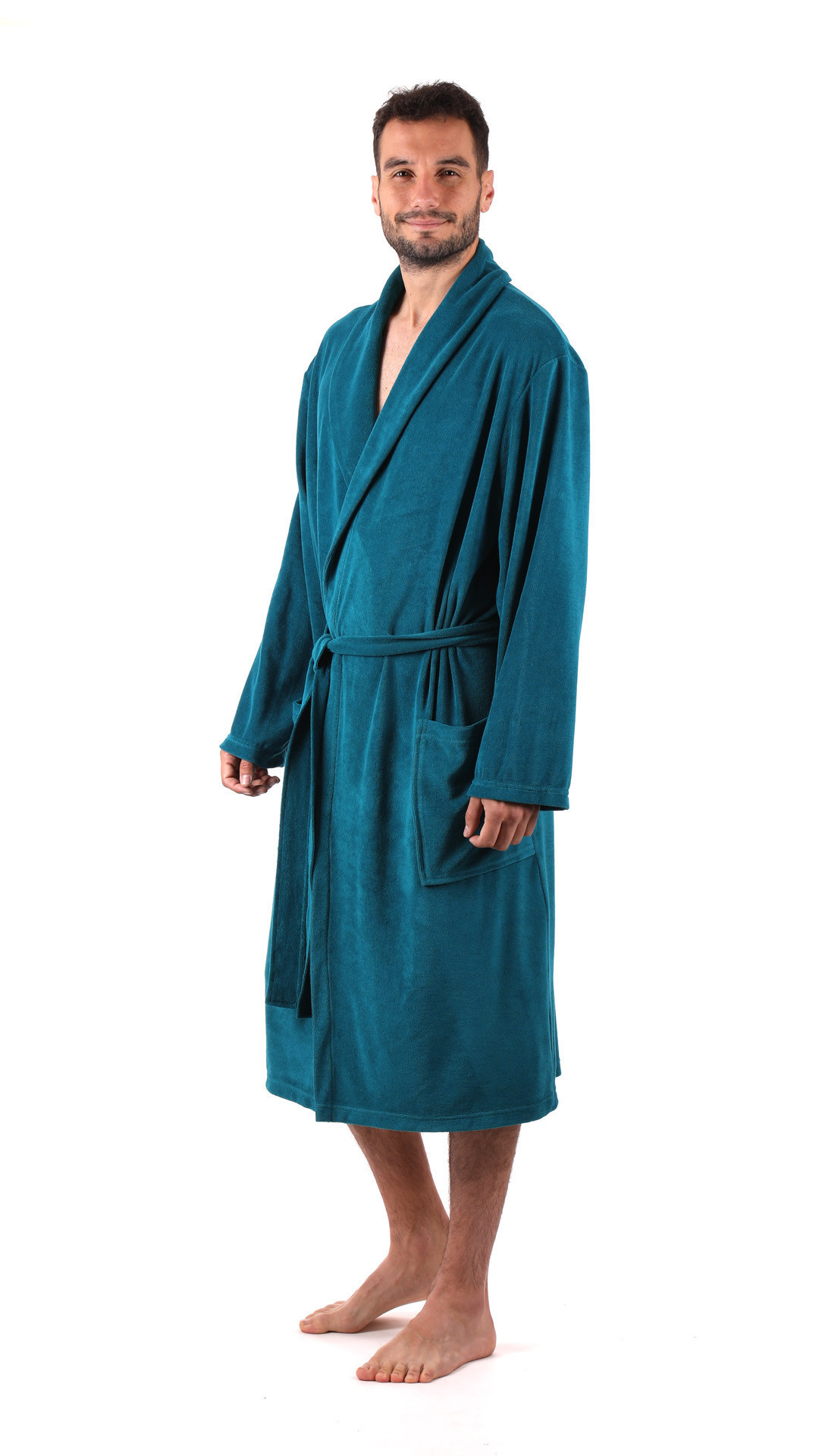 Lehký pánský bavlněný froté župan pro nerušené chvíle odpočinku. Materiál: lehký froté úplet ve složení 80 % bavlna, 20 % polyester Střih: klasický střih se šálovým límcem v délce 115cm Použití: jako lehký župan nejen na cestování vhodný o pro osušení Vyrábíme ve velikostech 3-6XL Potřebujete jinou než standardní velikost? Napište nám, ušijeme na míru podle potřeby vaší postavy. Pánský župan Bari vyniká svou lehkostí a nadčasovým střihem. Je ušitý z jemného, tenkého bavlněného froté, které je příjemné k pokožce a spolehlivě saje vlhkost. Díky tomu se hodí nejen po koupeli, ale i pro letní dny, kdy oceníte jeho vzdušnost. Župan má klasický šálový límec, dvě prostorné kapsy a pásek v pase. Elegantní design spojuje praktičnost a pohodlí, takže se stane vaším spolehlivým společníkem doma, u bazénu nebo na dovolené. Jeho lehký, měkký a zároveň savý materiál s vysokým podílem bavlny je ideální pro postavy s větší velikostí. Nebude vám v něm zbytečné teplo, nepřidává objem díky slabému splývavému materiálu, je pružný a přizpůsobí se vašim potřebám.Bari pánské: Bari petrolejováStřih: šálový límecMateriál: 80% bavlna 20% polyester froté úpletÚčel použití: volný čas/lehkéVhodné pro výšivku: vhodné pro všechny typy výšivek