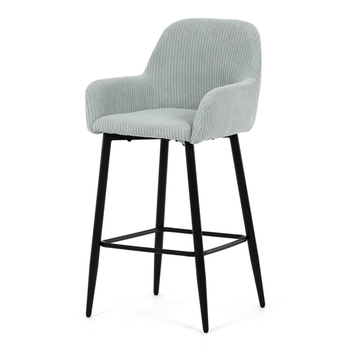 Barová židle s područkami v modrém manšestrovém potahu nabízí pohodlné posezení s příjemnou texturou látky, která je navržena pro dlouhou životnost a snadnou údržbu. Pevné černé kovové nohy zajišťují stabilitu a odolnost, přičemž jejich konstrukce obsahuje i praktickou opěrku nohou pro zvýšení komfortu při sezení. Ergonomicky tvarované opěradlo a područky poskytují dostatečnou oporu paží a zad, což přispívá k pohodlnému posezení u barového pultu nebo kuchyňského ostrůvku. Židle není otočná, což podtrhuje její jednoduchý a stabilní design vhodný do moderních i klasických interiérů. Nosnost a rozměry jsou přizpůsobeny běžným požadavkům na barové sezení.