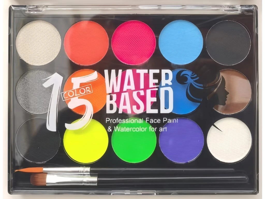 BARVY NA OBLIČEJ A TĚLO v plastovém pouzdře, 2 štětce, 15 odstínů barev.Barvy jsou na vodní bázi, netoxické. Vhodné na obličej i tělo.