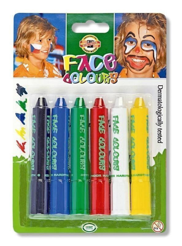 <p>Obličejové barvy – používají se pro líčení při příležitosti různých sportovních utkání, karnevalů, dětských oslav atd. Barevné jádro ve tvaru hranolu s kulatým zakončením, vloženého do plastového vysouvacího pouzdra s plastovým uzávěrem s tupou špičkou, (systém podobný rtěnce). Barvy v soupravě - bílá, žlutá, červená, zelená, modrá, černá. Rozměr O 18,3 mm (nejširší místo), délka 105,2 mm. Barvy jsou dermatologicky testovány a jsou netoxické.</p>