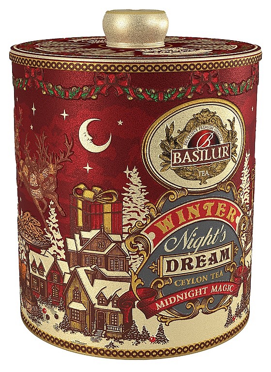 BASILUR Winter Night´s Dream Midnight Magic plech 100g Černý sypaný čaj Orange Pekoe s kousky třešně, květem chrpy a aroma třešňové zmrzliny ve vánoční plechové dóze. Černý čaj aromatizovaný s ochucujícími částmi rostlin (kousky ovoce), sypaný Složení: černý čaj OP 85,7 %, třešeň plod 10 %, chrpa květ 0,3 %, aroma (třešňová zmrzlina) Hmotnost: 100g Návod na přípravu: 1 sáček / lžičku na 250ml šálek, zalít vodou 100°C, louhovat 3-5 minut
