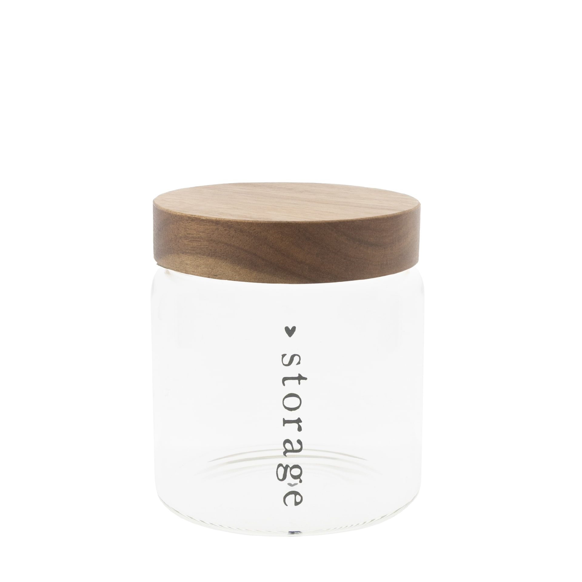 Bastion Collections Dóza s dřevěným víkem Storage 13 cm nápis, čirá barva, přírodní barva, sklo, dřevo. Skleněná dóza od holandské značky Bastion Collections hezky zaplní kuchyňskou poličku a potraviny v ní uložené budou zároveň i krásnou dekorací. Ideální bude na cukr, domácí granolu, oříšky, sušené bylinky, kávu apod.