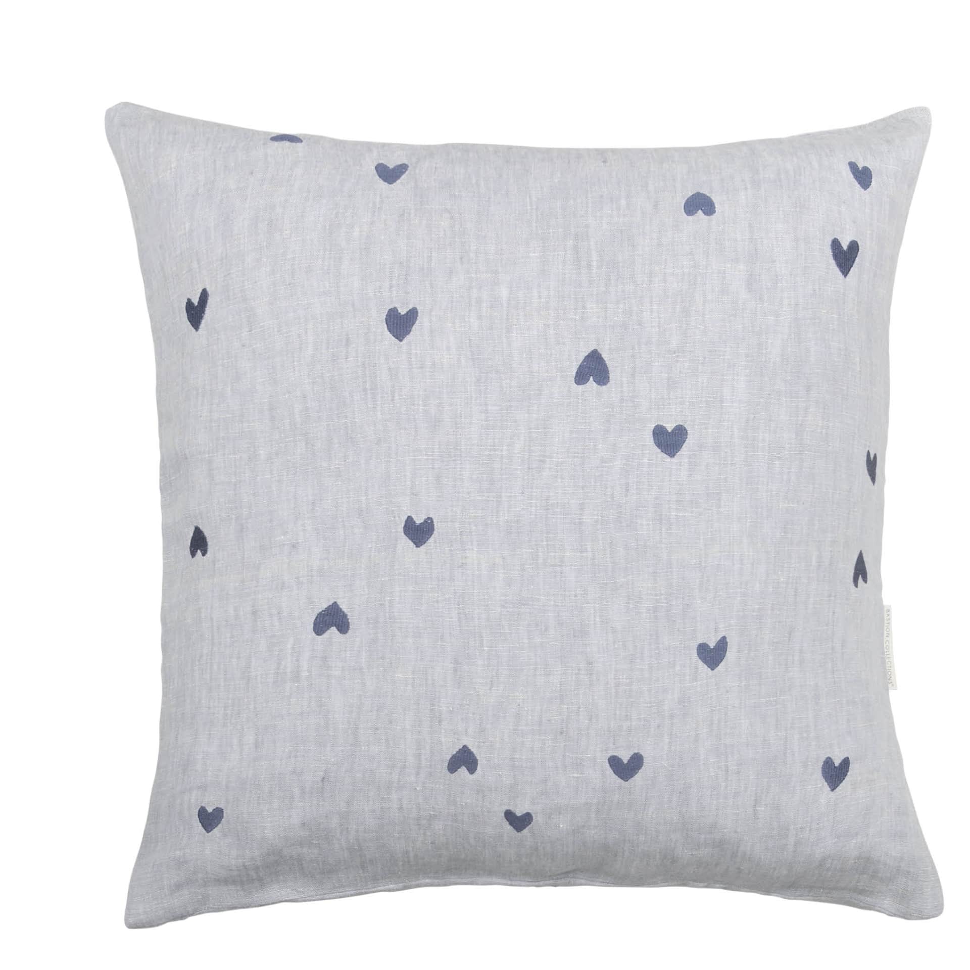 Polštář zdobí krásný motiv vyšitých srdíček v tmavě modré barvě a na boku pak nechybí štítek s logem značky.