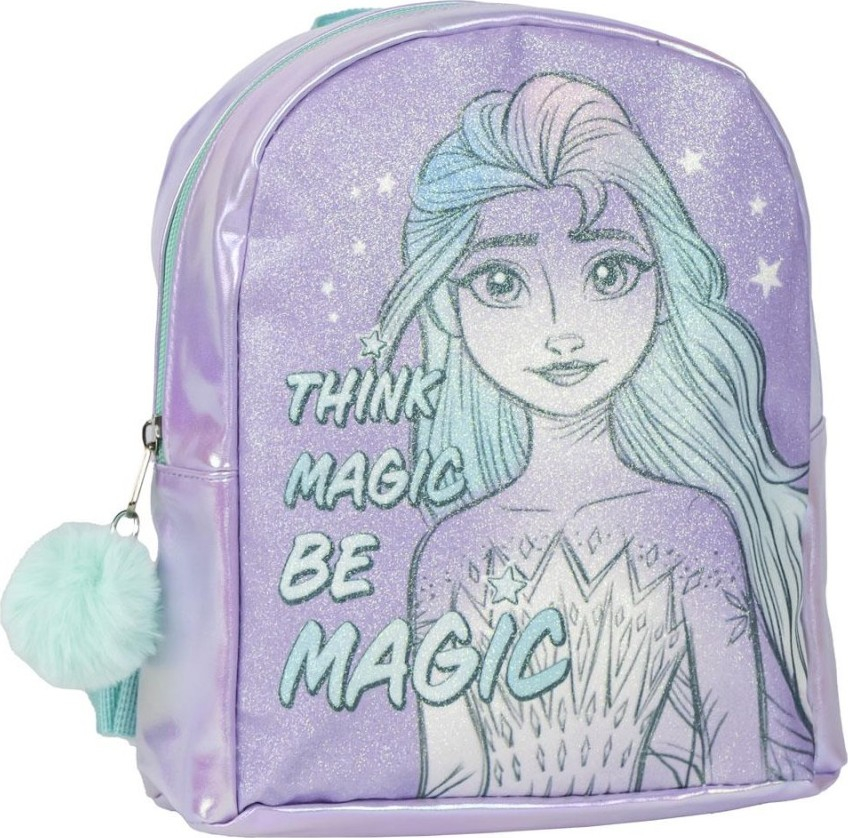 Batůžek s bambulí a aplikacemi Ledové království – na zip, s délkově nastavitelnými popruhy. Velikost batůžku 19×18×23 cm.