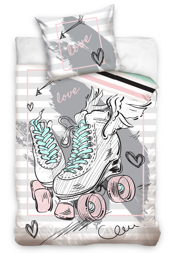 Holčičí povlečení s bruslemi Dívčí povlečení barevnými Kolečkové brusle Roller Dance, je vyrobeno ze 100 % hladké bavlny renforce a je oboustranné"Božské" diskotékové brusle Roller, by měla vlastnit každá slečna a dívkaNejen že jsou velice módní, ale hlavně oblíbenéNa lícní straně povlaku přikrývky jsou "Rollerky" s růžovými kolečky a tyrkysovými tkaničkami na pruhovaném, šedo bílém podkladuReverzní strana povlaku přikrývky je pruhovaná, pruhy černé, růžové a tyrkysově zelené vedou vodorovněPovlak polštáře je z obou stran stejný, šedo bílými, vodorovnými pruhyVe středu polštáře je růžový čtverec s růžovým nápisem love, černou šipkou a srdíčkem Povlečení perte vždy z rubu, se zapnutým zipem, dle symbolů uvedených na obale!Nepoužívejte prací prostředky s obsahem bělících a rozjasňujících substancí!Doporučujeme odstřeďování při nižších otáčkách, aby nedošlo k trvalému poškození bavlněných vláken Odstíny barev obrázků se mohou barevně lišit, v závislosti na nastavení Vašeho monitoru