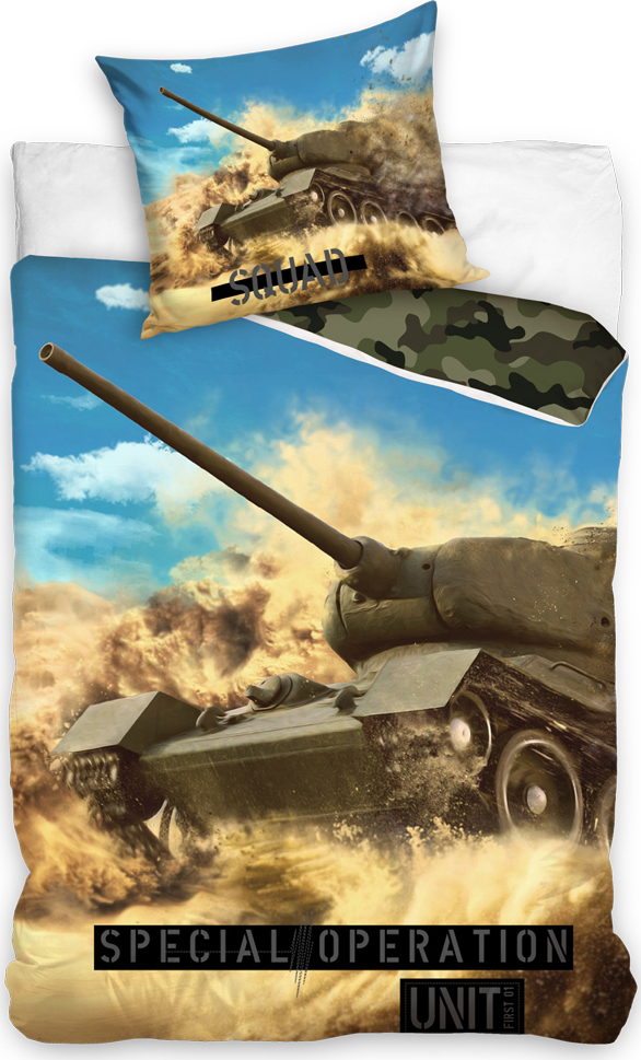 Bavlněné povlečení Tank Speciální Operace Ložní povlečení Tank Speciální Operace, je vyrobeno ze 100% hladké bavlny renforce, prošlo sanforizací a je oboustrannéNa lícní straně povlečení je speciální obrněné vozidlo, se svou speciálně vycvičenou posádkouProjíždí písečnými dunami pouště ke speciální vojenské operaciReverzní strana povlaku přikrývky je vyrobena se vzorem "maskáčovým", takže vypadá jako pravá vojenská celtaPovlak polštáře je z obou stran stejný, s velkým tankem uprostřed Bavlněné povlečení má rozměry 140x200/ 70x90 cm a je opatřeno zipovým zapínánímVhodnou barvou prostěradel bude středně modrá, béžová a světle hnědá Doporučujeme prát z rubu, se zapnutým zipovým uzávěrem a dle symbolů uvedených na obalePři praní nepřekročujte stupně praní uvedené na obale!Nepoužívejte prací prostředky s obsahem bělících a rozjasňujících substancíOdstřeďujte při nižších otáčkách, aby nedošlo k polámání, a tak k trvalému poškození bavlněných vlákenAvivážní prostředky nedoporučujeme používat, mohou slepit vlákna a tím snížit savost Odstíny barev obrázků se mohou barevně lišit, v závislosti na nastavení Vašeho monitoru