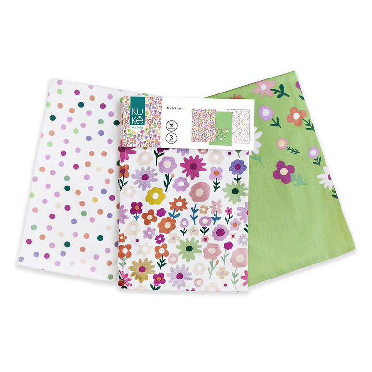 Krásné bavlněné utěrky jsou dekorativním a zároveň praktickým doplňkem v kuchyni. Sada obsahuje tři kusy utěrek s milým květinovým a puntikatým potiskem v jasných barvách.