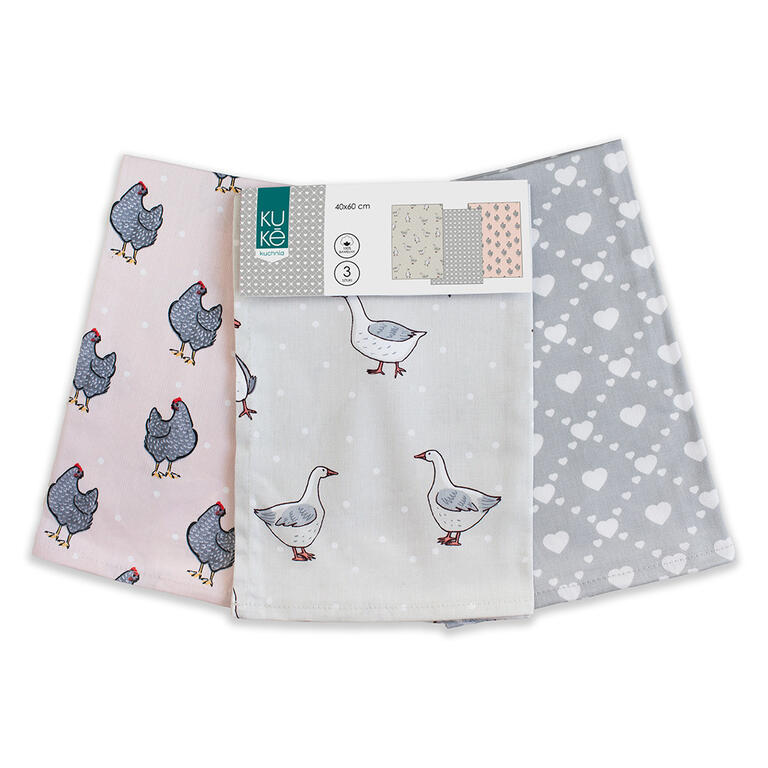 Krásné bavlněné utěrky jsou dekorativním a zároveň praktickým doplňkem v kuchyni. Sada obsahuje tři kusy utěrek s milým designovým potiskem - slepičky, husy a srdíčka.