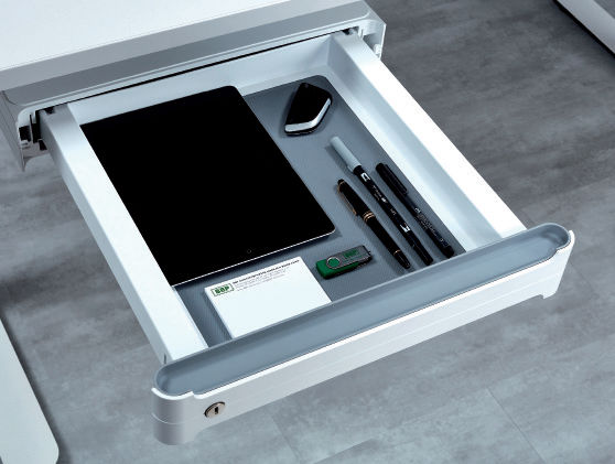 Zásuvka pod stolovou desku OrgaWork- vhodná pod jakoukoliv stolovou desku díky flexibilnímu systému uchycení- ideální pro výškově stavitelné stoly- díky otočnému čelu zásuvky je možno namontovat zásuvku na pravou i levou stranu stolu- dno zásuvky protiskluzovou úpravou- plnovýsuvy s tlumením- lehce udržovatelný povrch s odolnou povrchovou úpravou proti škrábancům- barva bílá, nebo černá- obsahuje zámek Lehmann (nutno dokoupit cylindrickou vložku viz související produkty)- vhodné pro stoly s maximální výškou spojovací tyče 50 mm- vnitřní rozměr: šířka 305 × hloubka 345 × výška 40 mm- vnější rozměr: šířka 430 × hloubka 410 × výška 70 mmVolitelné komponenty:- distanc (sada distančních dílů)-obsahuje ( 1 ks distanční díl přední, výška 53 mm; 2 ks distanční sloupky zadní, výška 53 mm; 6 ks šroubů 4,5 × 70 mm pro montáž do stolové desky)- pro spojení dvou zásuvek nad sebou použijte šrouby 4 × 30 mm (není součástí balení)