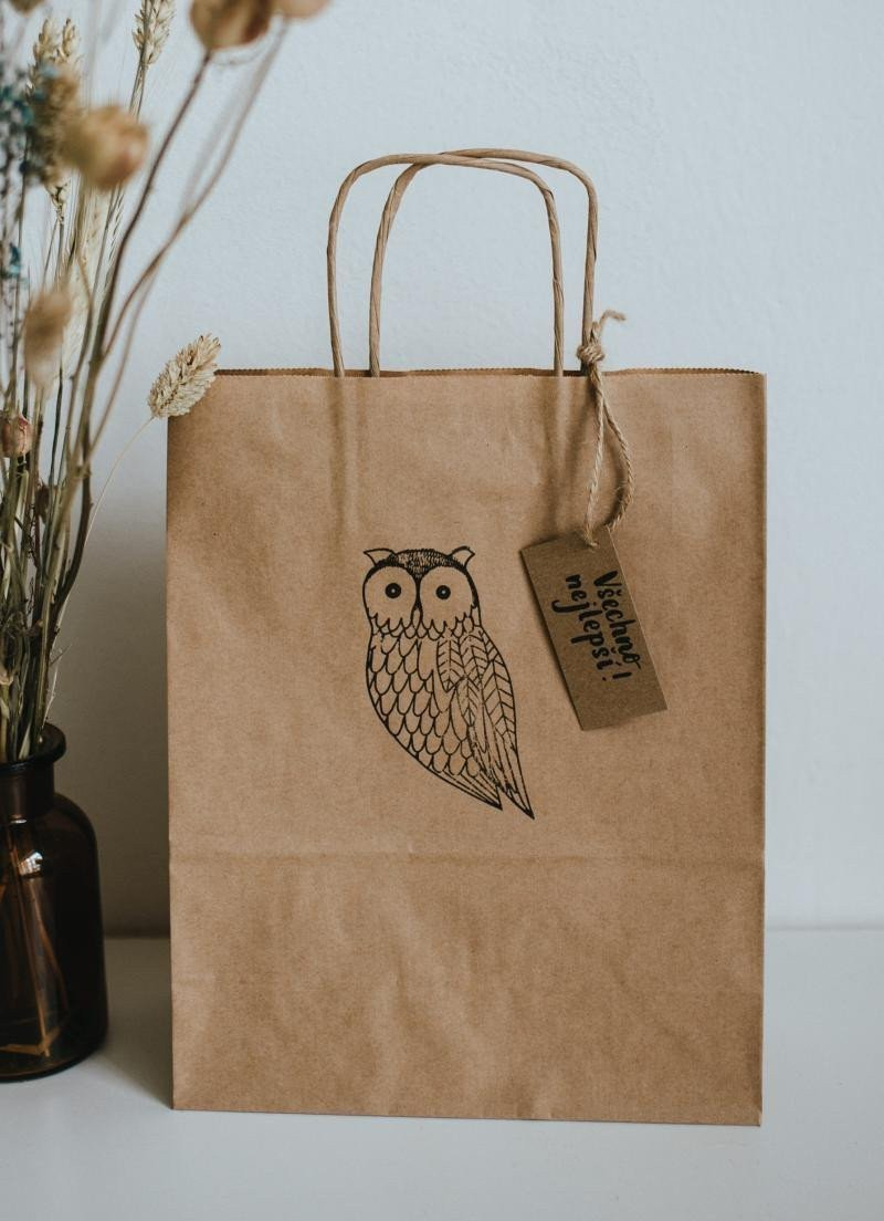 Be Nice přírodní dárková taška s motivem sovičky a ozdobnou jmenovkou. Rozměry 22 x 28 cm