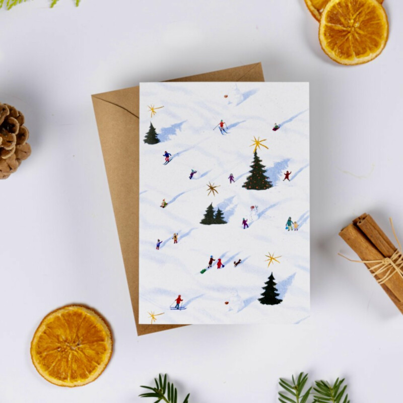 Zimní dovádění ve sněhu, červené tvářičky a padající vločky. Zimní radovánky představují vše, co v zimě toužíme dělat. Vyjádřete se skrze krásné zimní přání. Obsahuje: 1 ks přání 12 x 17 cm 1 ks obálka Autorský design Design přání nakreslila Lela Geislerová. V tomto designu jsme vytvořili také balicí sadu, krabičky, samolepky a papíry. Šetrně k přírodě Papír je recyklovaný a recyklovatelný. Je potištěn barvami splňujícími normy REACH. Vyrobeno v ČR Přání bylo vyrobeno v naší rodinné tiskárně v Jesenici u Prahy.