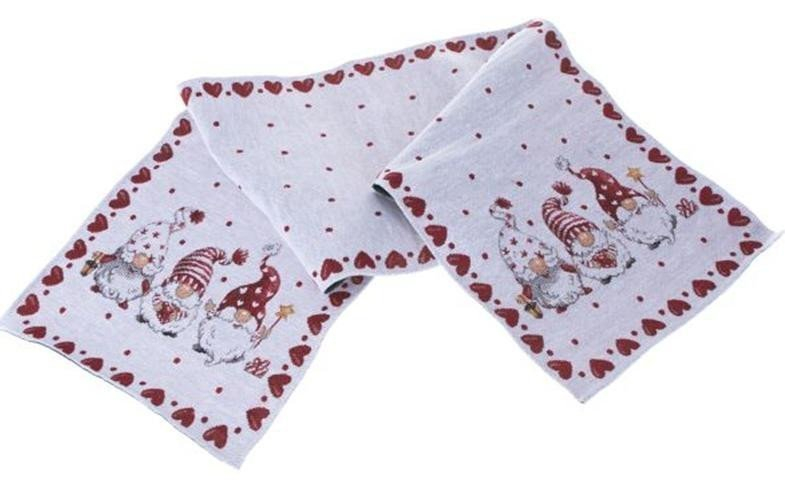 Elegantní běhoun na stůl s veselými skřítky krásně ozdobí vaši domácnost. 33 x 140 cm Prát při 30°Může se žehlit. Nesmí se sušit, bělit a chemicky čistit