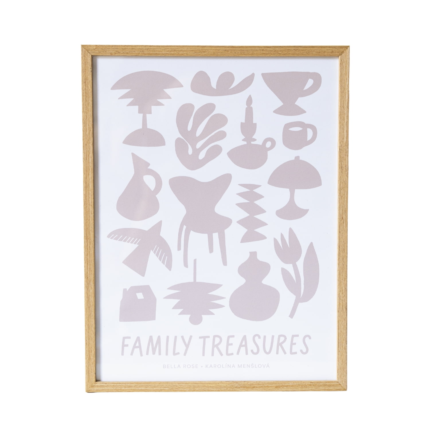 Plakát z kolekce Family Treasures je jemným, a přesto výrazným prvkem interiéru. Originální motiv v osobitém rukopisu Karolíny Menšlové minimalisticky vyobrazuje rodinné poklady a podtrhuje tak harmonickou atmosféru domova.