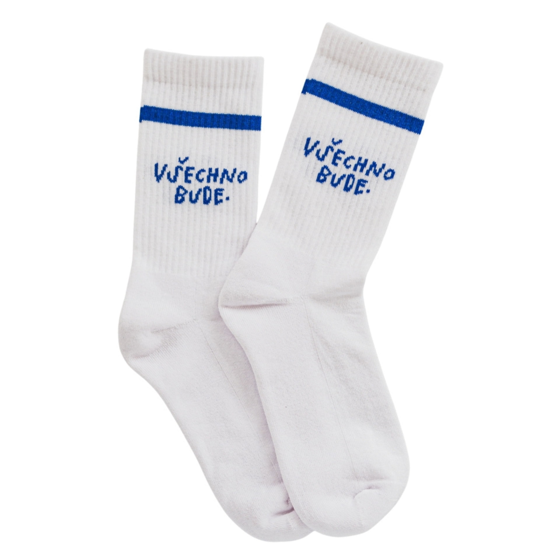 Bílé ponožky z autorské kolekce Bella Rose mají kobaltově modrý proužek u lemu, a na obou z vnějších stran nápis Všechno bude. v hravém rukopisu Zuzky Bartíkové alias Flatwhite lettering. Takže žádná tuctovka – ale malý kousek humoru a originality každým krokem.