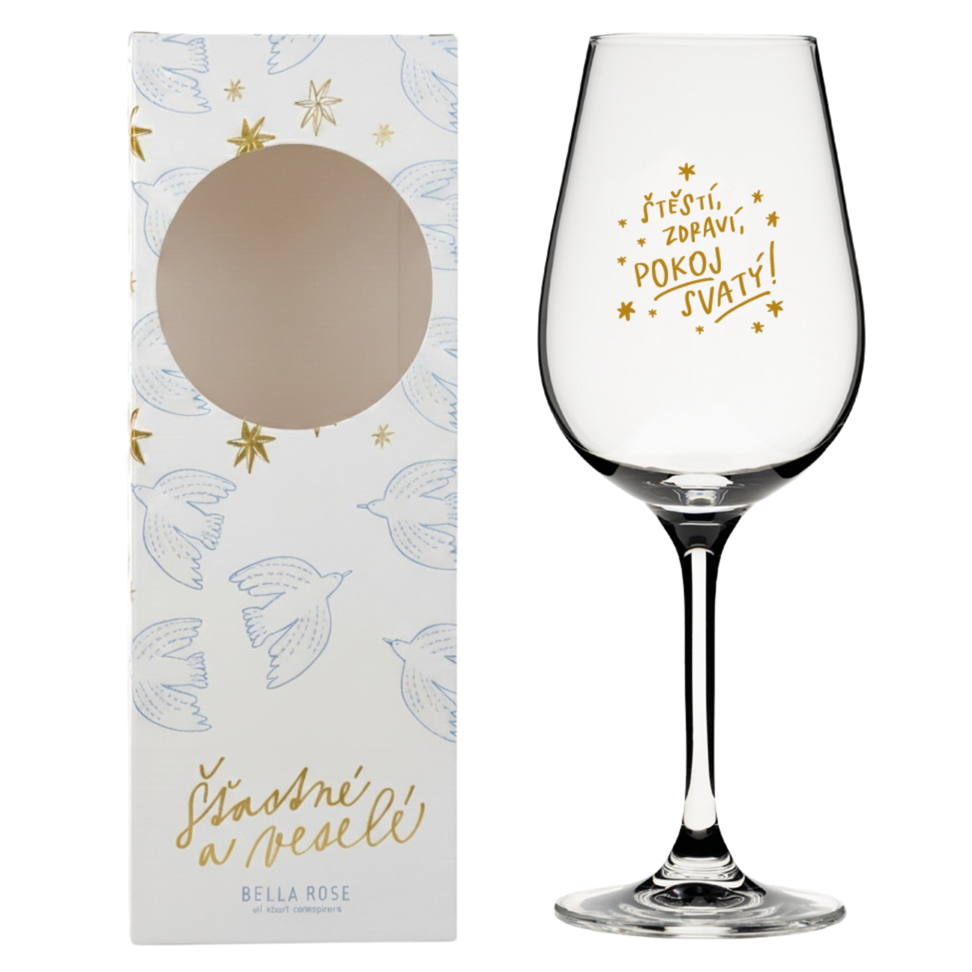 Bella Rose Sklenice na víno Štěstí, zdraví, pokoj svatý + vánoční krabička, čirá barva, sklo.
