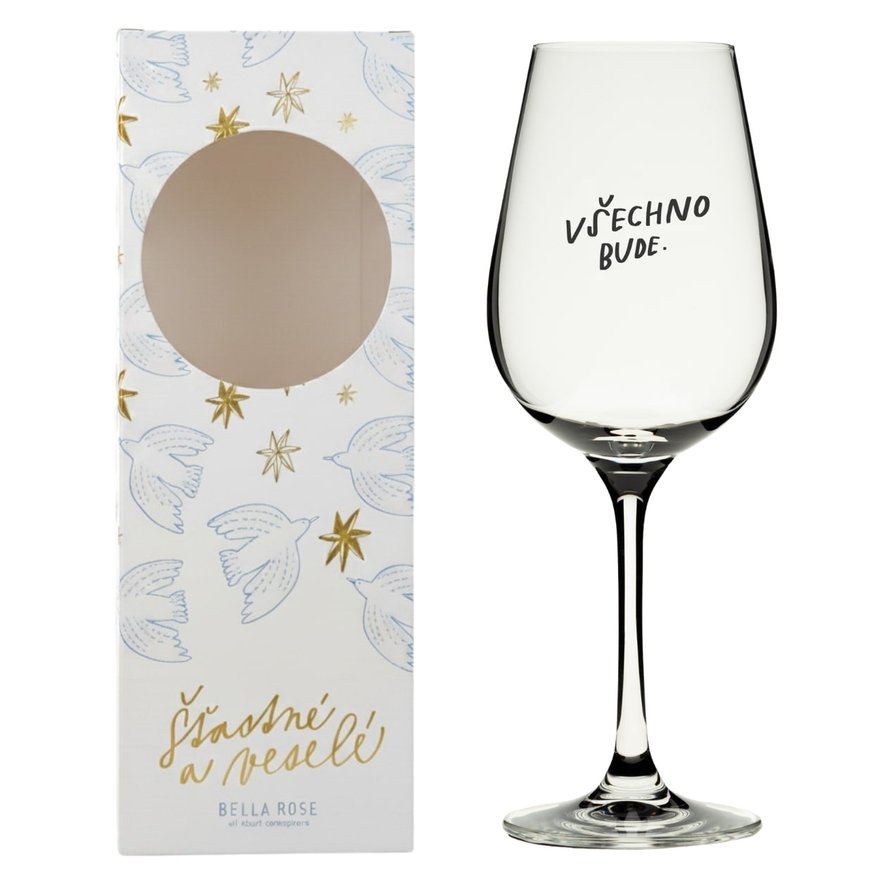 Bella Rose Sklenice na víno Všechno bude No. 2 + vánoční krabička, čirá barva. Všechno bude. Tichá připomínka, že i když se svět zrovna netočí podle plánu, pořád je tu něco, co potěší. Třeba sklenka bílého vína. Sklenice na víno z autorské kolekce Bella Rose nese ručně psaný nápis v novém fontu od Zuzky Bartíkové – výřečný detail, který dodává sklenici nadhled i kapku humoru.