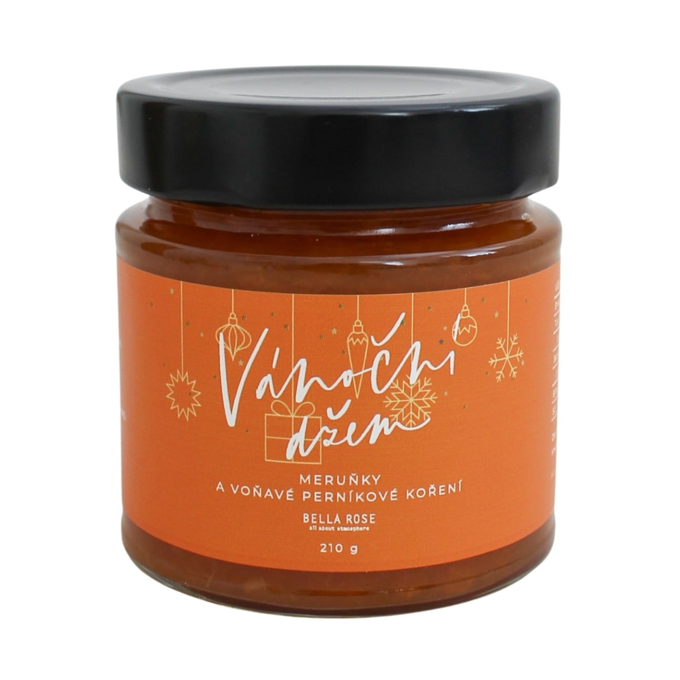 Bella Rose Vánoční meruňkový džem s perníkovým kořením 210 g, oranžová barva. Vychutnejte si tu pravou chuť Vánoc s naším lahodným džemem, který v sobě nechává souznít slaďoučké meruňky a hřejivé tóny perníkového koření.