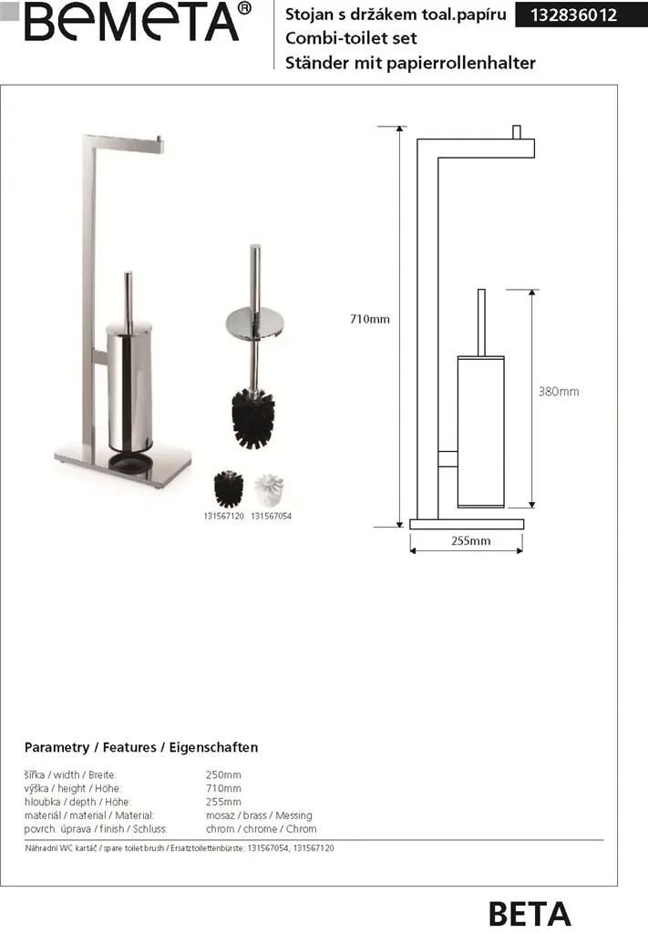 BETA stojan s držákem toaletního papíru a WC štětkou 132836012 PARAMETRY Povrchová úprava Pochromováno Barva Stříbrná, Bílá Hmotnost 3.642 kg Hloubka 255 mm Šířka 150 mm Výška 710 mm
