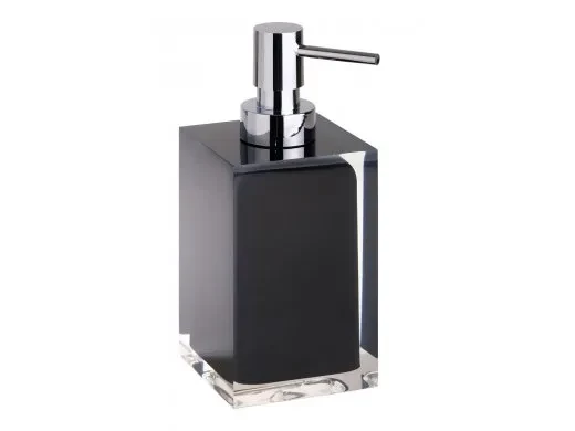 VISTA: Dávkovač tekutého mýdla na postavení Parametry: šířka: 72 mm výška: 110 mm hloubka: 72 mm Objem: 250 ml materiál: polyresin povrch. úprava: čirá, černá