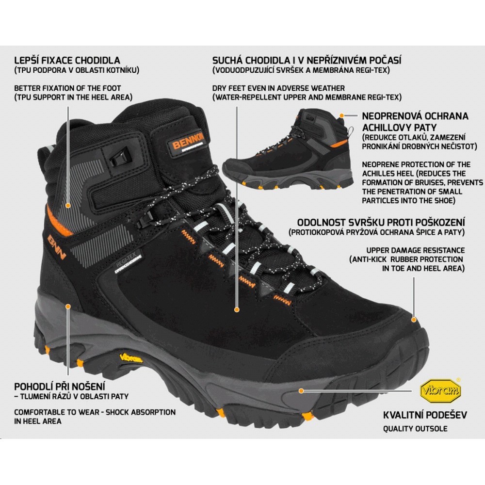 Obuv BENN HOMBRE unisex trekové kotníkové na vibramu sympatex černé • Klasická treková obuv kotníkového střihu určená k celoročnímu použití v náročných venkovních terénech. • SVRŠEK - kvalitní hovězinová useň NUBUK s hydrofobní úpravou tl. 2,0-2,2 mm. Velmi pevně drží kotník. Kombinace stability, pevnosti a podpory paty. • PODŠÍVKA - SYMPATEX® značková nepromokavá a prodyšná membrána. • PODEŠEV - VIBRAM® – New Bifi da: značková, kvalitní oděruvzdorná a olejivzdorná pryž s protiskluzným dezénem. Dokonale chrání chodidlo při pohybu v těžkém terénu. • SYSTÉM ŠNĚROVÁNÍ - Dvojitý bezpečnostní šněrovací systém: hladká průběžná očka s ložiskovou kuličkou na nártu v kombinaci s háčky na kotnících, které rychle a přesně fixují nohu. • Velikost 36-49