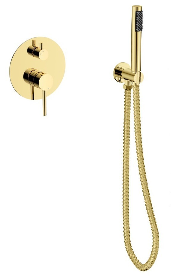 Jedinečný sprchový/vanový podomítkový set s příslušenstvím VEO ve zlaté barvě. Kompletní řešení pro vaši vanu. Set obsahuje podomítkovou baterii, vývod ze stěny s držákem, ruční sprchu a hadici. Baterie je dodávána včetně podomítkového modulu, ten výrazně usnadňuje montáž. Dodáváme v pěti barvách chrom, černá, grafitová, zlatá a zlatá jasná.Spojením současného minimalismu s klasickými detaily vznikla série baterií VEO. Součástí balení VEO zlatá barva je podomítková baterie VEO + podomítkový modul + ruční sprcha + sprchová hadice + vývod a držák ruční sprchy. Přednosti podomítkové baterie VEO černá: Barva: zlatá Podomítková sprchová/vanová baterie s příslušenstvím Elegantní klasika Anti line aretator (proti usazování vodního kamene) Moderní perlátor NEOPERL Keramická kartuše KEROX Sprchová hadice odolná proti přetočení Kvalitní přepínač sprchy / vany Prověřená technologie Pákové ovládání baterie Vše testováno se 100% úspěšností Všechny díly odpovídají předpisům EN817 Včetně podomítkového modulu Set obsahuje podomítkovou baterii, vývod ze stěny s držákem, ruční sprchu a hadici POZOR - Sprchové a vanové baterie lze používat pouze s dodatečnou instalací dílu – zpětné klapky, která zabraňuje zpětnému nasátí vody a tím znečištění vodovodního řádu. ZÁRUKA 5 LET