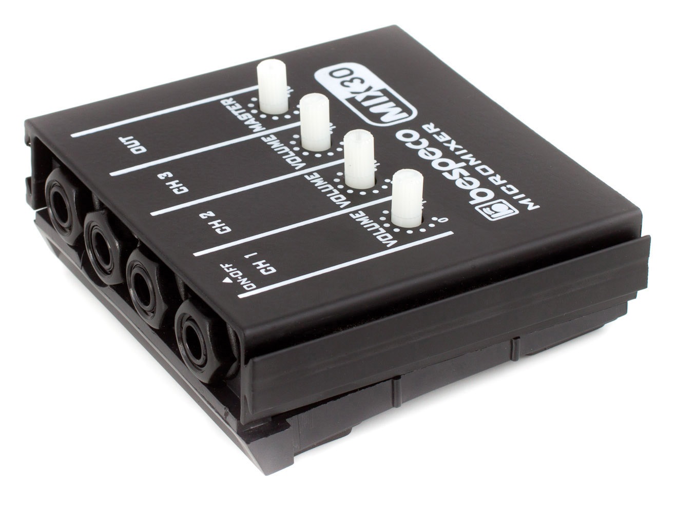 Mixážní pult na baterie Bespeco MIX30 je jednoduchý malý tříkanálový mixážní pult, který umožňuje připojení 3 mono signálů, jejich následné smíchání pomocí potenciometrů volume a odeslání na mono výstup. Napájení pultu je řešeno 9 V baterií (není součástí balení).