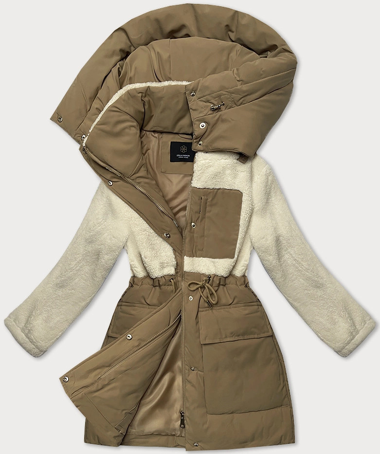 Věnujte prosím pozornost při výběru velikosti dle velikostní tabulky uvedené níže. Velikosti neodpovídají běžně nošené konfekci. Bunda se vsadkami typu beránek Bunda má jednoduchý střih, je zateplená tenkou vrstvou syntetické péřové výplně, má tři kapsy a zapíná se zipem a panelem s patentkami. Model má kapuci, kterou je možné odepnout. V pase modelu je stahující šňůrka. Bunda má délku pod boky. Složení: 100 % polyester.