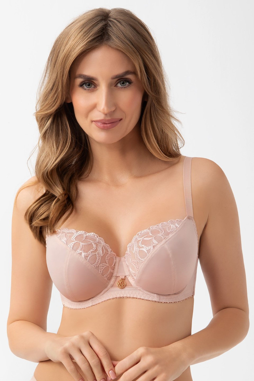 Biustonosz miękki przeznaczony dla kobiet ze średnim, dużym oraz bardzo dużym biustem Zapewnia efekt bardzo mocnego uniesienia i zebrania biustu do środka 3-częściowe miski wykonane z kryjącej dzianiny typu simplex oraz haftu podszytego tiulem stabilnym Tył z lycry zapewniającej bardzo dobre dopasowanie i podtrzymanie Fiszbiny boczne zapobiegające zwijaniu się materiału W zależności od rozmiaru dwu lub trzyrzędowa haftka obleczona microfibrą z trójstopniową regulacją obwodu Nieodpinane, regulowane ramiączka w c