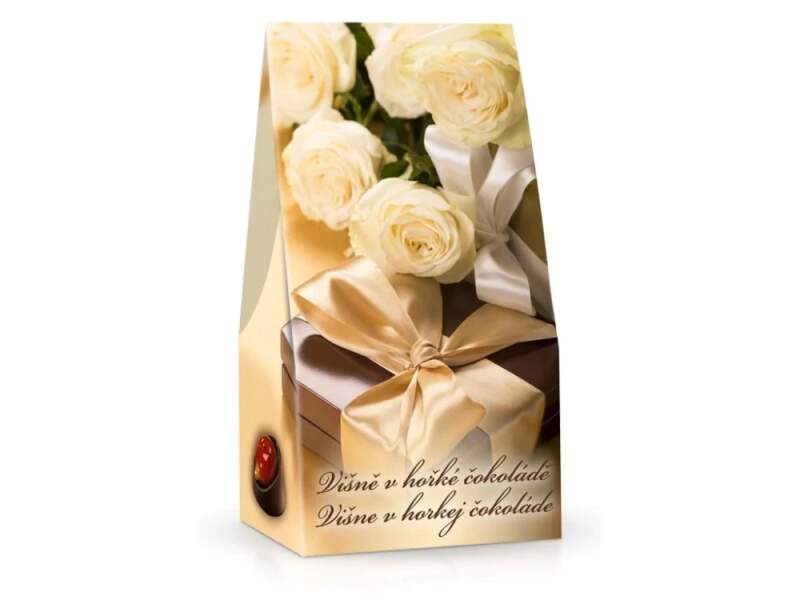 Čokoládové pralinky z extra hořké čokolády (obsah kakaa min. 50%) s celou višní a s likérem v krásném dárkovém balení s motivem bílých růží Složení: čokoláda (cca 60%), cukr, kakaová hmota, kakaové máslo, emulgátor: sójový lecitin, přírodní vanilkové aroma. Náplň (cca 40%), glukózovo-fruktózový sirup, celá višeň (37% náplně), likér (8% náplně), aroma. Informace pro alergiky: Výrobek může obsahovat stopy pšeničného glutenu, mléka, ořechů a mandlí. Čistá hmotnost: 84 g Výrobce: Laica, Itálie Výživové údaje na 100 g energetická hodnota 1893 kJ / 440 kcal tuky 19,4 g z toho nasycených 12,1 g sacharidy 50,3 g z toho cukry 40,6 g bílkoviny 3,7 g sůl 0,00 g