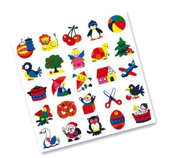Nepostradatelná pomůcka do dětských kolektivů - identifikační značky pro nejmenší - obrázky místo jmenovek o rozměrech 4x4 cm, papírové, samolepící, 25 kusů s jednoduchými barevnými veselými motivy.