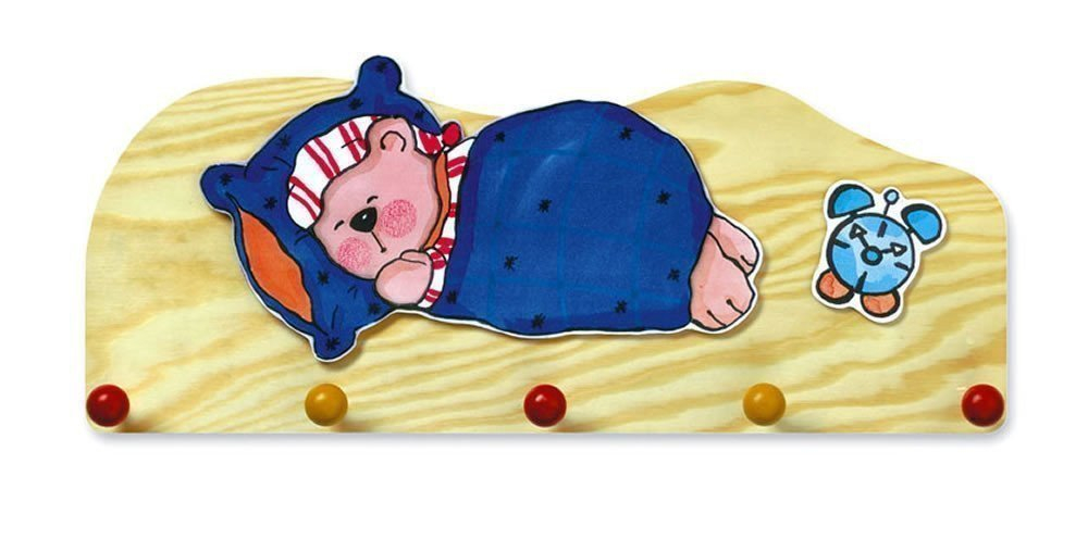 Dřevěný věšák jako dekorace do každého dětského pokojíčku, s pěti úchyty, přírodní dřevo, s barevným obrázkem spícího medvídka. rozměry: 60x5x24 cm