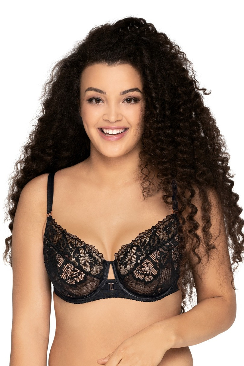 Biustonosz typu semi soft, w kolorze black. Wykonany na sprawdzonej konstrukcji K-1030. Dolna część misek została częściowo wzmocniona beżową pianką a całość obszyto czarną koronką. Biustonosz posiada ozdoby takie jak złote klamerki czy satynowe taśmy. Ramiączka – nieodpinane, szerokość dopasowana do rozmiaru, regulowane - metalowy, antyalergiczny regulator. Zapięcie – dwurzędowa, trójstopniowa haftka. Brak fiszbin bocznych. Skład: 88% Poliamid, 8% Bawełna, 4% Elastan