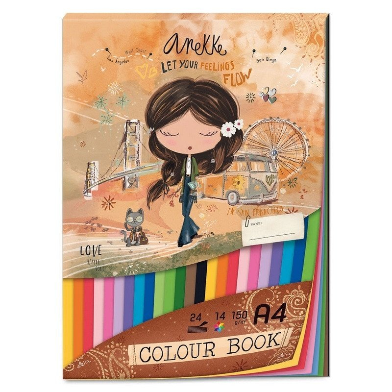 Blok barevného papíru velikosti A4 s designem známého děvčátka Anekke z dílny španělské návrhářky. • blok obsahuje 24 barevných listů v 14 barvách • list barevného papíru váží 150g • vhodné jsou na výtvarní výchovu a kreativní tvoření zvláště pro pevnější gramáž papíru