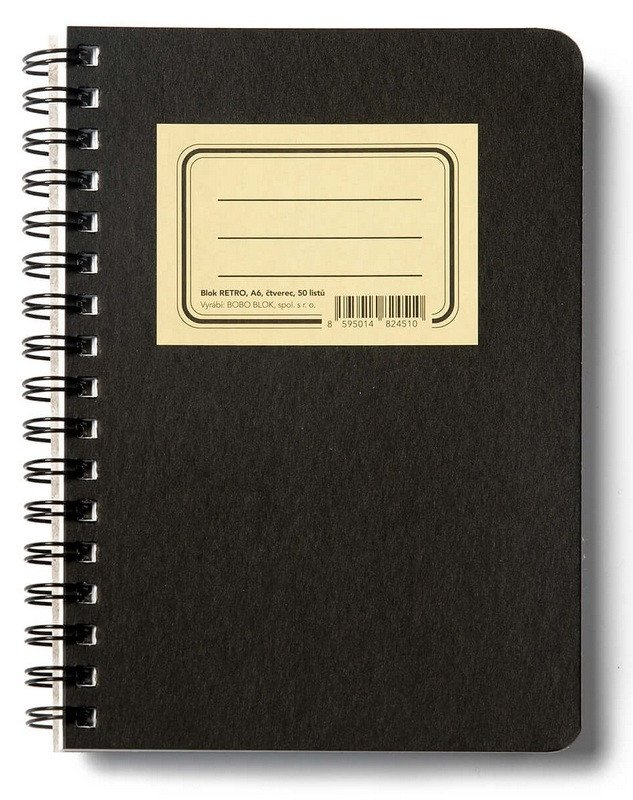 Blok na poznámky. blok s boční kroužkovou vazbou pevné desky (1000g) v RETRO designu formát A6 retro bloky dodáváme ve formátech A4, A5, A6 bloky RETRO mají náplň ze 70 g papíru obsah: 50 listů