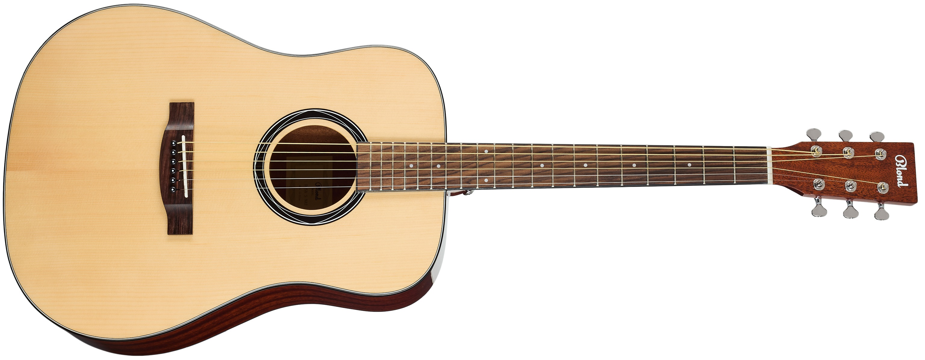 Akustická kytara Akustické kytary značky Blond jsou cenově dostupné nástroje vhodné pro začínající hudebníky. S jejich pomocí si osvojí základní techniky a dovednosti, navíc za cenu, která nijak nezatíží rodinný rozpočet. Blond D-SA S NAT je akustická kytara s populárním tělem typu Dreadnought a polomasivní konstrukcí. Přední deska kytary je zhotovena z masivu smrku, zadní deska a luby jsou vyrobeny z vrstveného mahagonu. Ke krku ze dřeva o