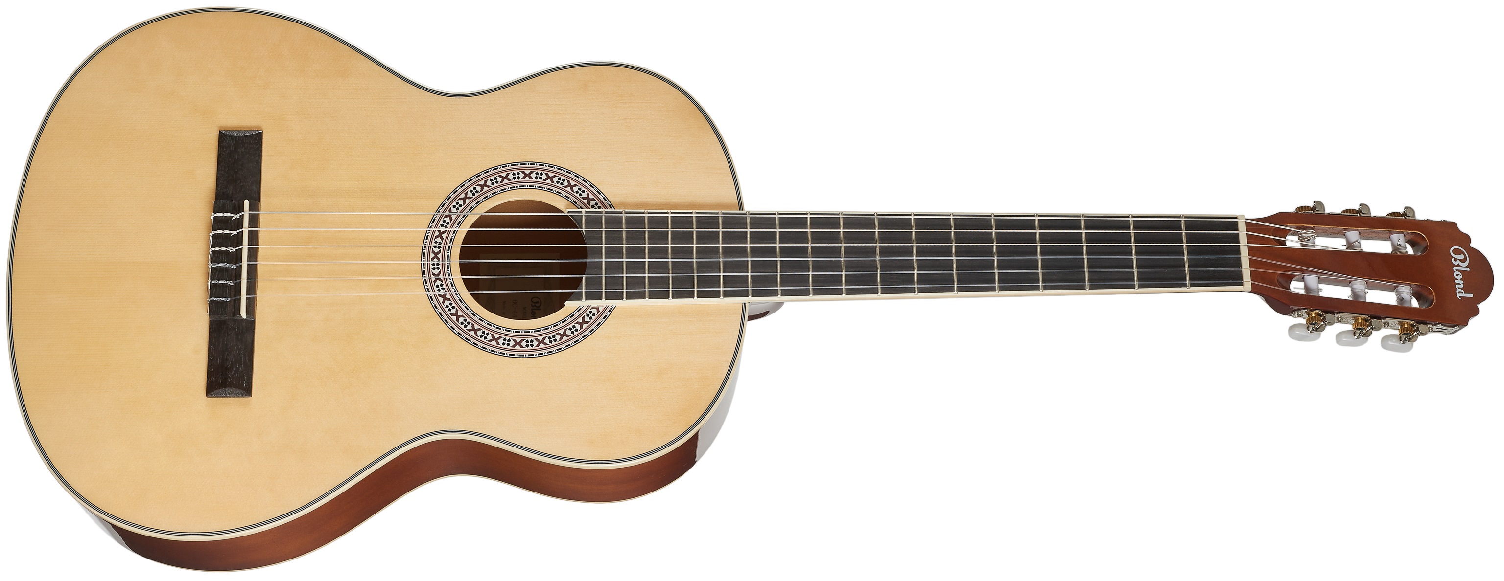 Klasická kytara Klasické kytary značky Blond jsou cenově dostupné nástroje vhodné pro začínající hudebníky. S jejich pomocí si osvojí základní techniky a dovednosti, navíc za cenu, která nijak nezatíží rodinný rozpočet. Klasická kytara Blond OC-44 NAT v 4/4 velikosti nabízí tělo zhotovené z vrstveného smrku a lípy, krk ze dřeva okoumé a hmatník a kobylku z moderního kompozitního materiálu. Struny jsou přes plastový nultý pražec uchyceny v klasických chromovaných mechanikách