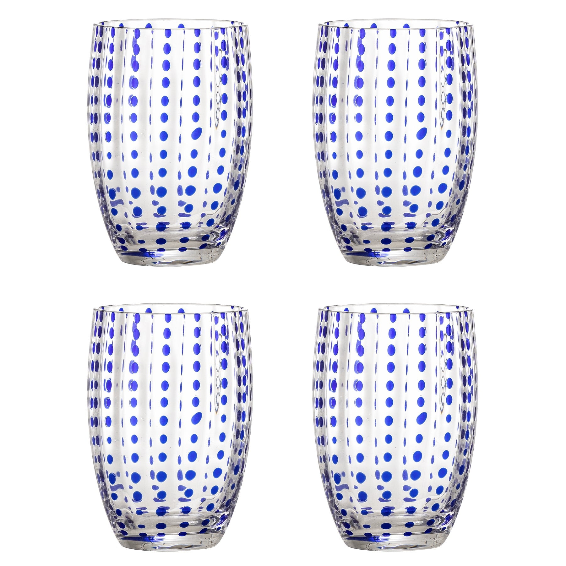 Vyšší skleničky s modrými puntíky budou jako stvořené pro letní drinky nebo ranní čerstvé ovocné šťávy. Jsou balené po čtyřech kusech, budou tedy i ideální jako dárek pro někoho, kdo si rád zdobí svůj domov neobyčejnými kousky. objem 350 ml / průměr 7,5 cm / výška 11 cm Vyrobeno ze skla.